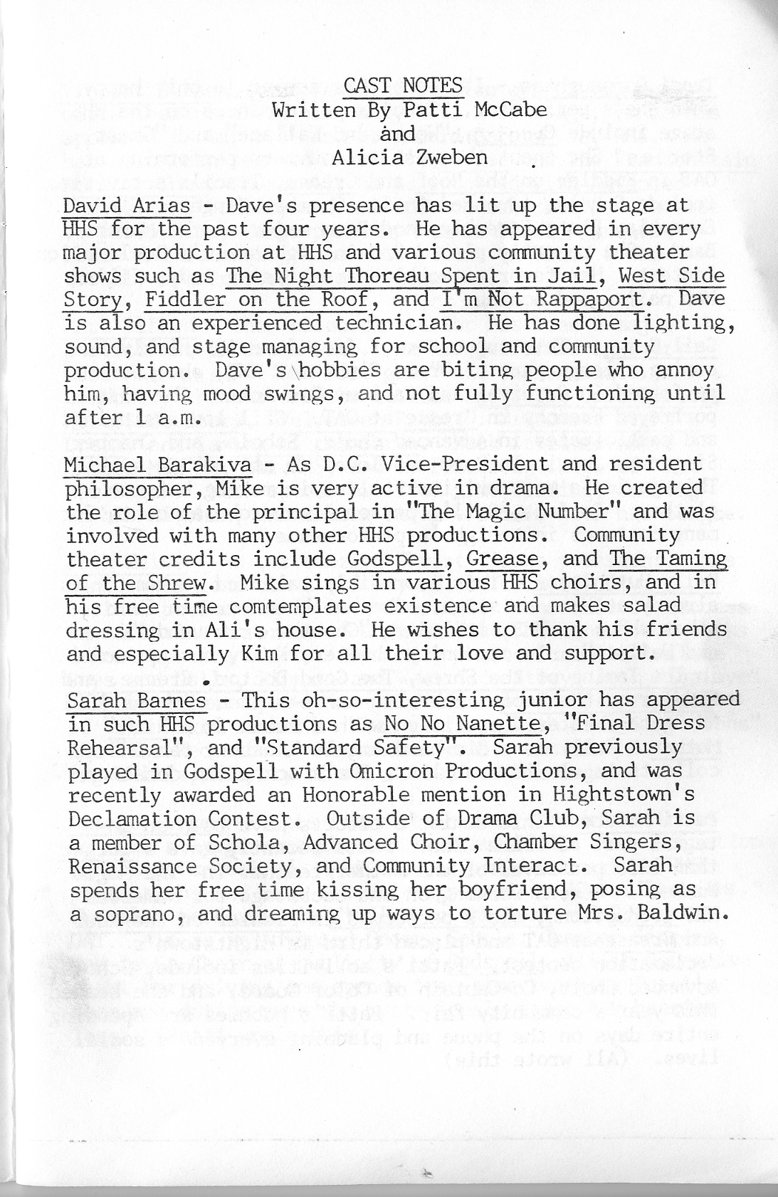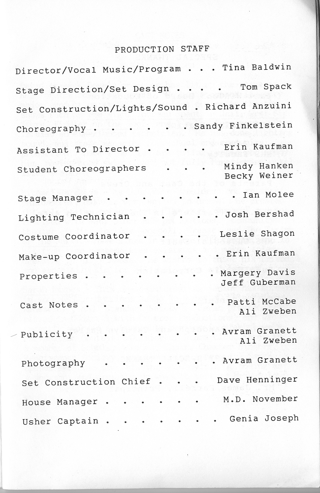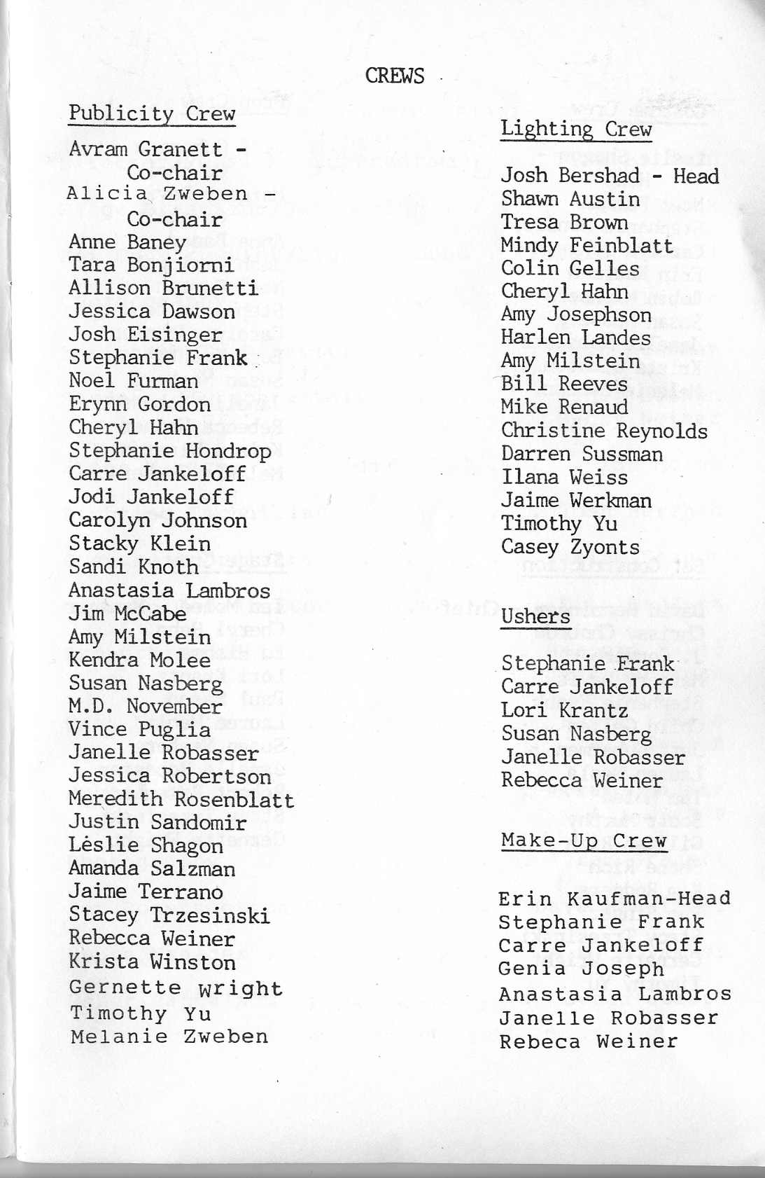 Anne Baney, Christina Carter, Margery Davis, Sylvie Eisenberg, Josh Eisinger, Jodi Felt, Avram Granett, Genia Joseph, Scott Koenig, Seth Kreisler, Jim McCabe, Robin Michaels, Emily Niebo, B.J. O’Brien, Sabrina Pramberger, Lauren Renehan, Josh Small, Timothy Yu