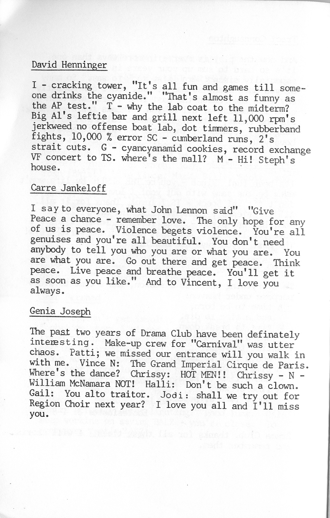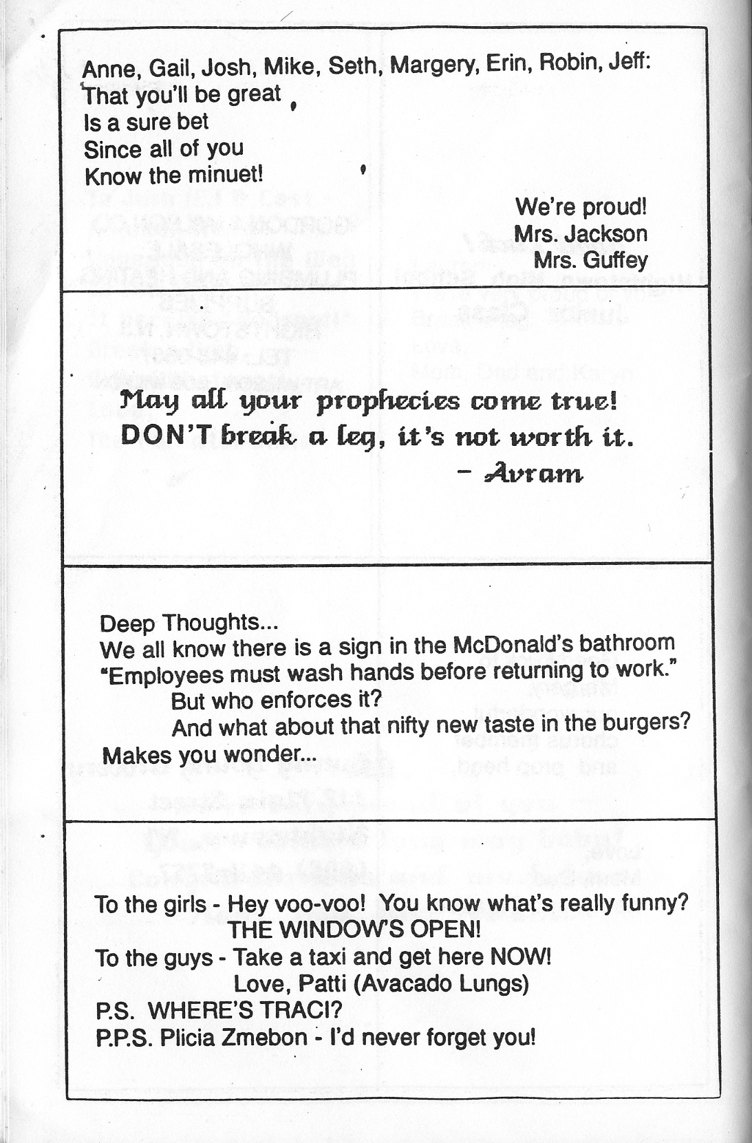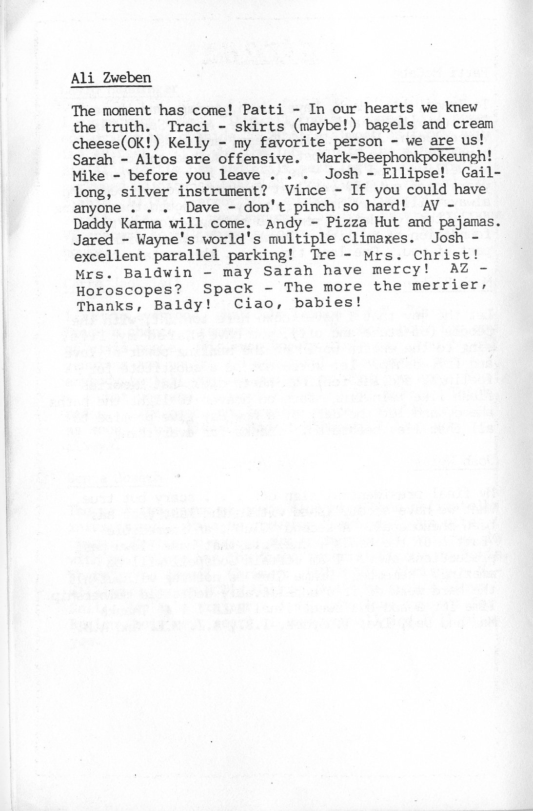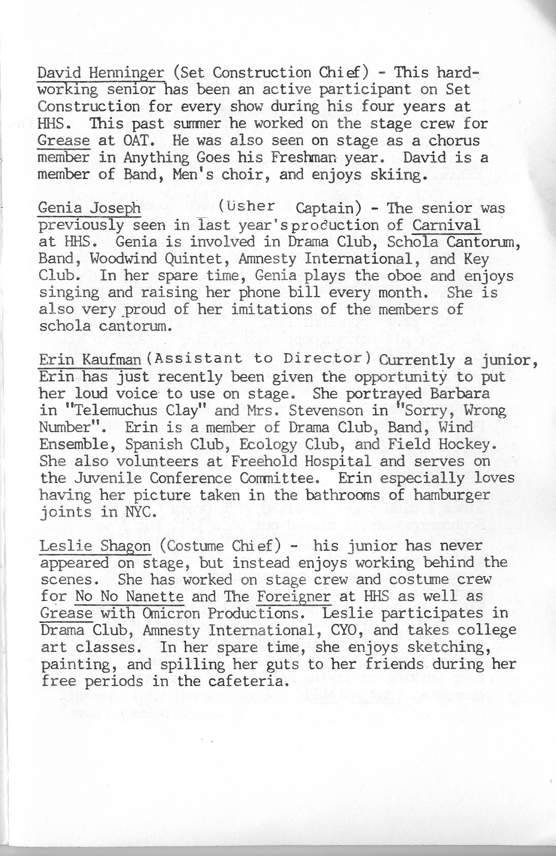 Anne Baney, Christina Carter, Margery Davis, Sylvie Eisenberg, Josh Eisinger, Jodi Felt, Avram Granett, Genia Joseph, Scott Koenig, Seth Kreisler, Jim McCabe, Robin Michaels, Emily Niebo, B.J. O’Brien, Sabrina Pramberger, Lauren Renehan, Josh Small, Timothy Yu